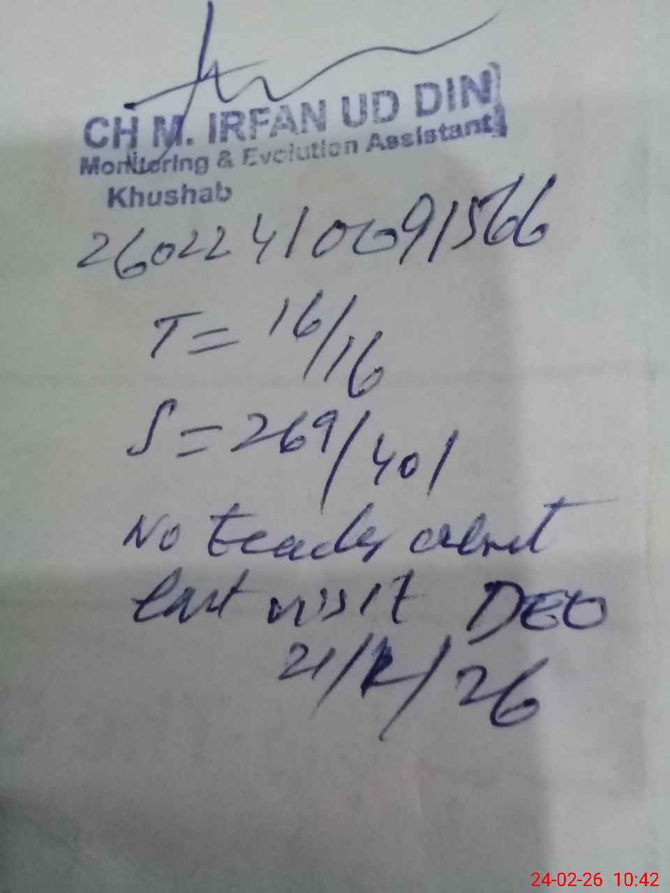 | Remarks (Use Separate Page if Required): gghs uchali student on sis 401 student on register 401 head count 369 no teacher absent last visit DEO 21/1/26 equipment for science lab required swings and slides required | |||||