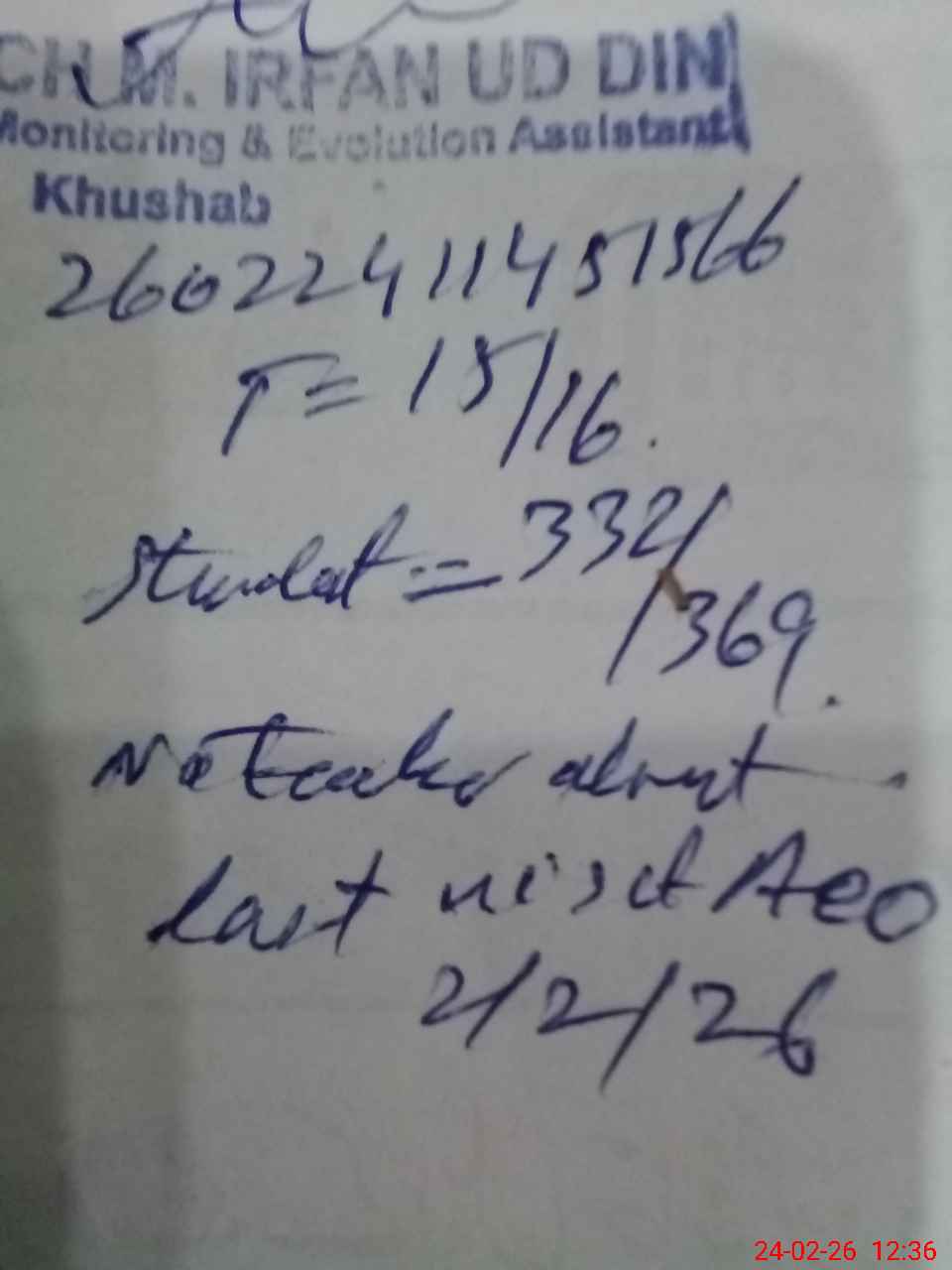 | Remarks (Use Separate Page if Required): gghs mardwal student on sis 369 student on register 369 head count 332 no teacher absent one on attachment last visit aeo 2/2/26 science lab required on immediate basis class rooms required washroom required | |||||