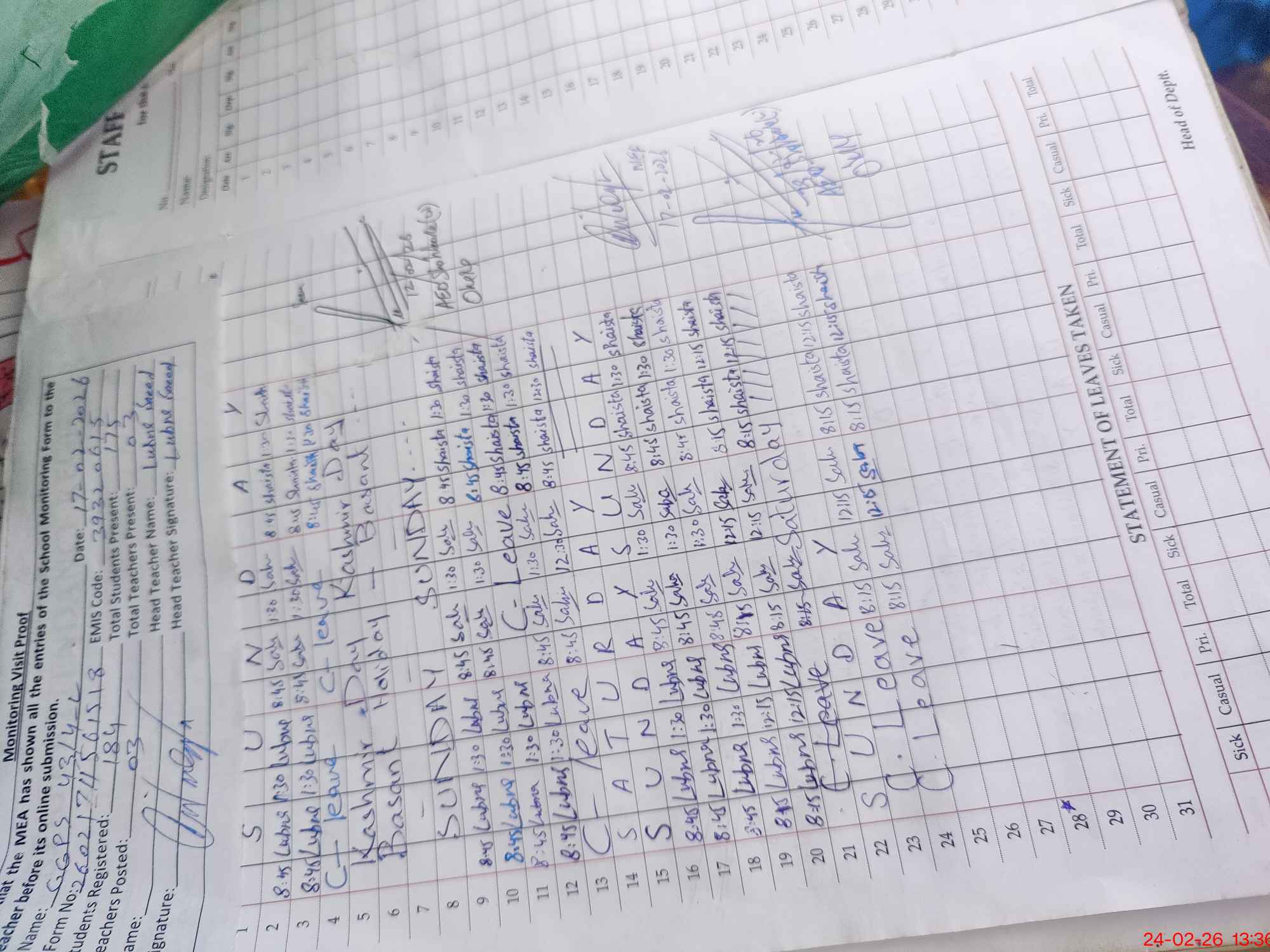 | No. of Students Present - Female | 0 | 0 | 30 | 26 | 24 | 28 | 17 | 174 | ||||||||
