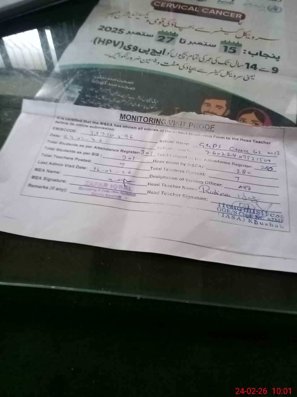| Attendance Register | Head Teacher | MEA with School | Visit Proof |