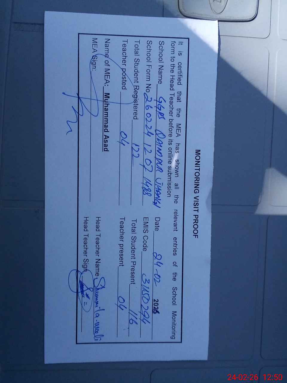 | Attendance Register | Head Teacher | MEA with School | Visit Proof |