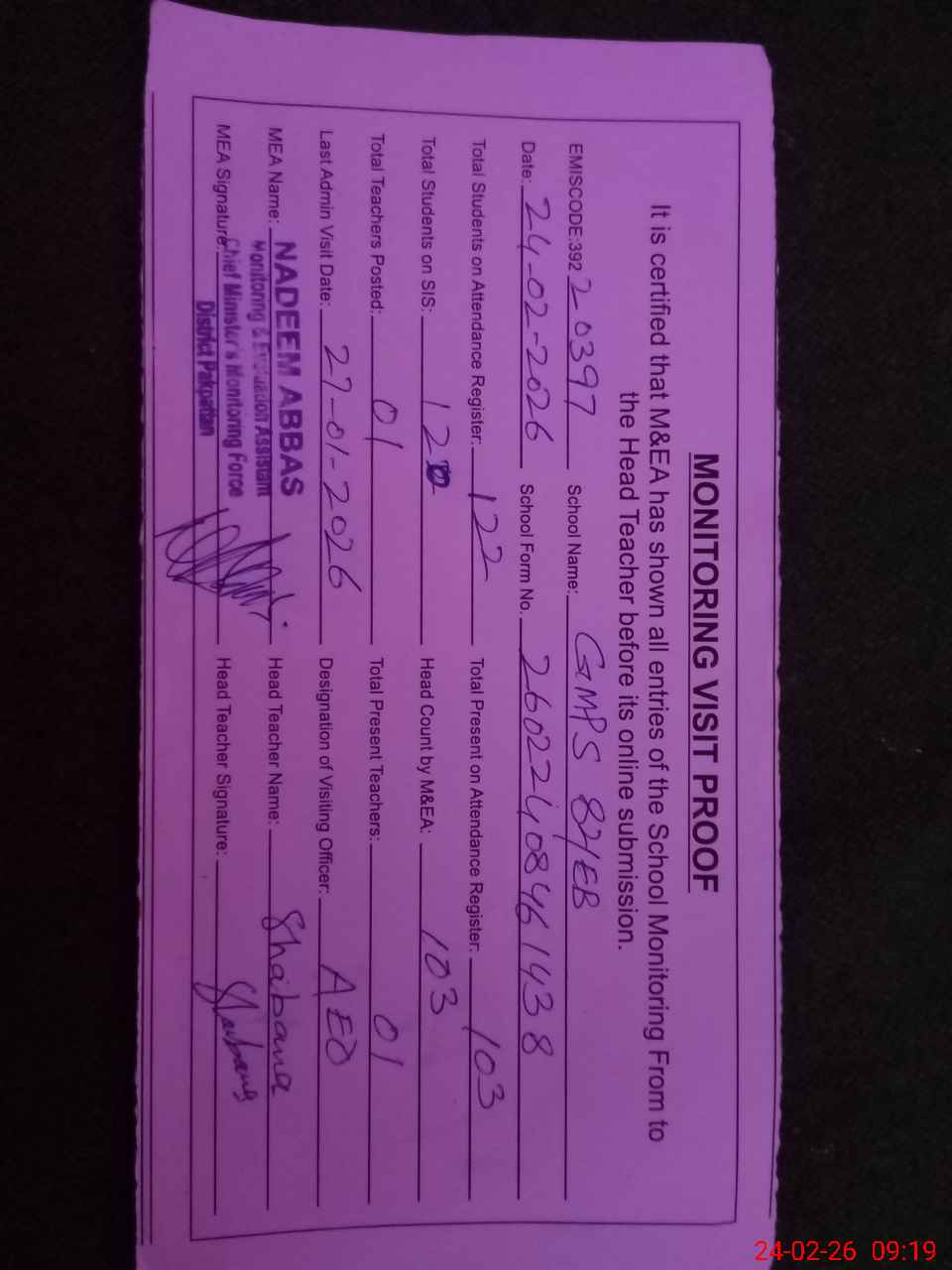 | Attendance Register | Head Teacher | MEA with School | Visit Proof |