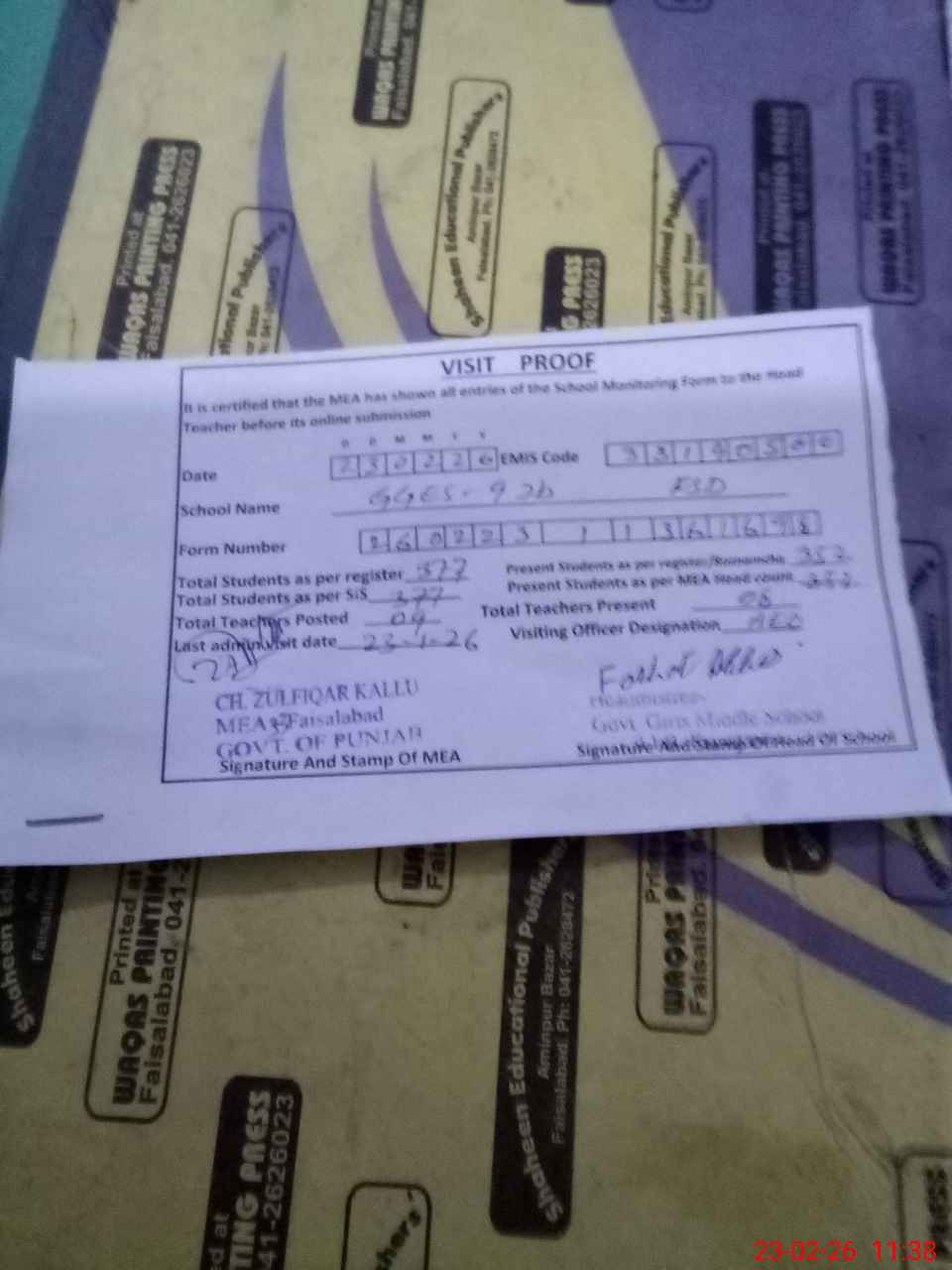| EMIS Code: 33140500 | Name of School: GGES CHAK 9 JB BHOLAY WAL | |||