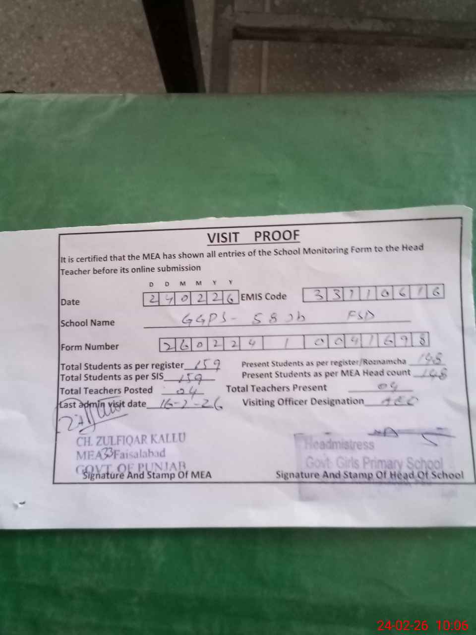 | Certified that this School was Inspected by the Undersigned MEA/DMO Today and the Information Stated Above is as Per Record. | |||||