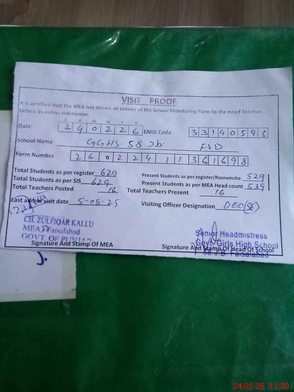 | EMIS Code: 33140595 | Name of School: GGHS CHAK NO 58 JB FSD | |||
