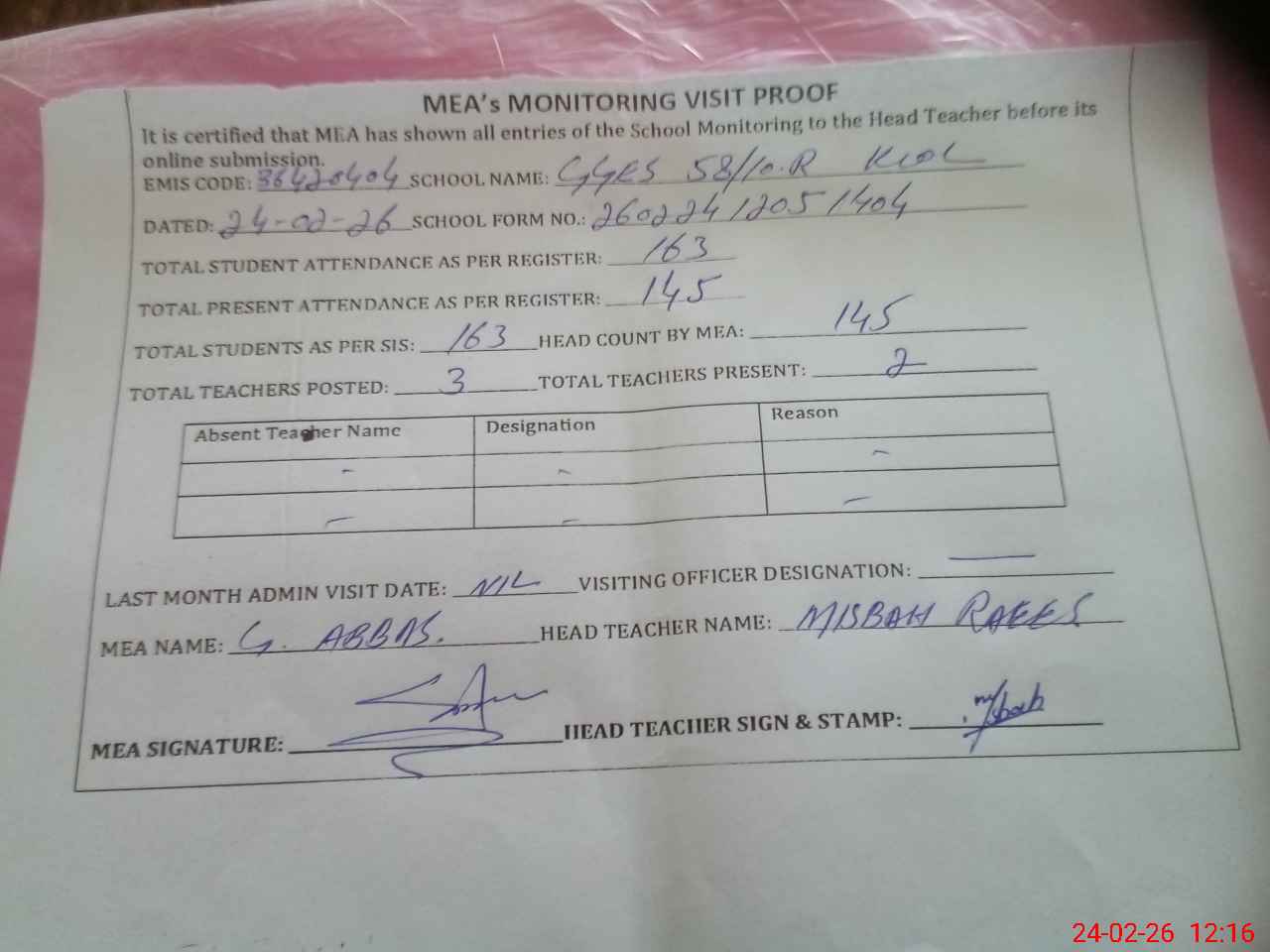 | EMIS Code: 36420404 | Name of School: GGES 58/10-R, KHANEWAL | |||