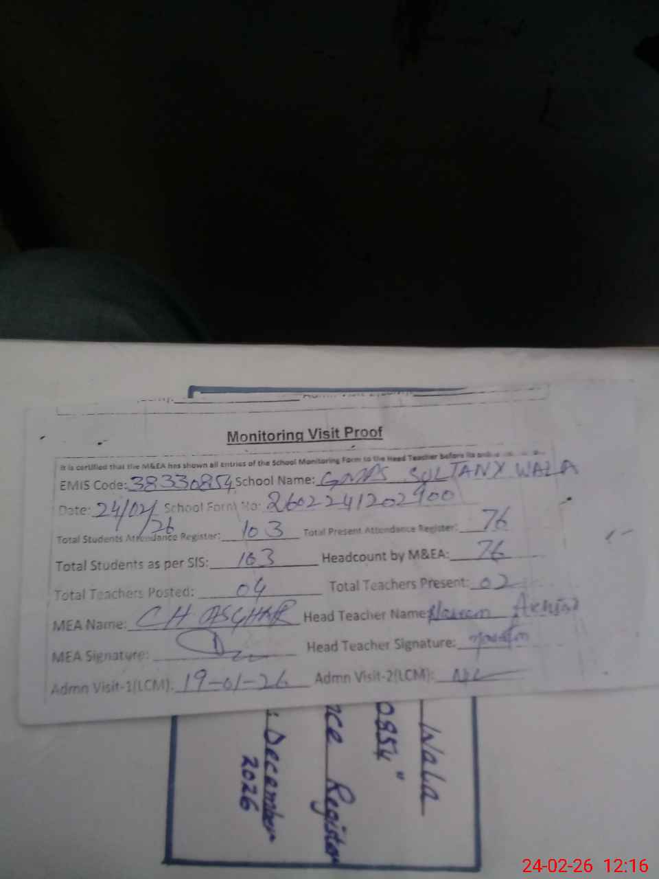 | EMIS Code: 38330854 | Name of School: GMPS SULTANY WALA | |||