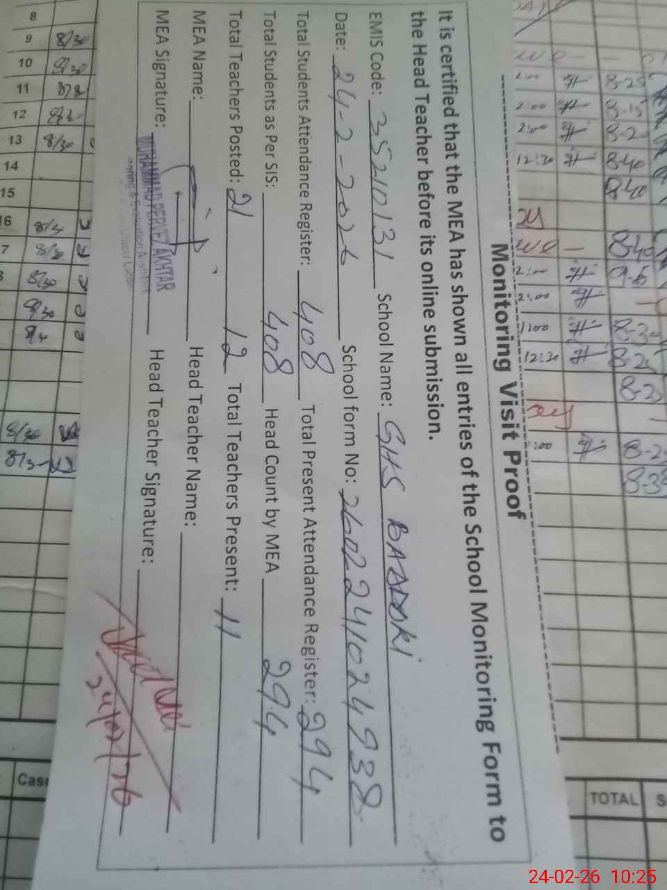 | Attendance Register | Head Teacher | MEA with School | Visit Proof |