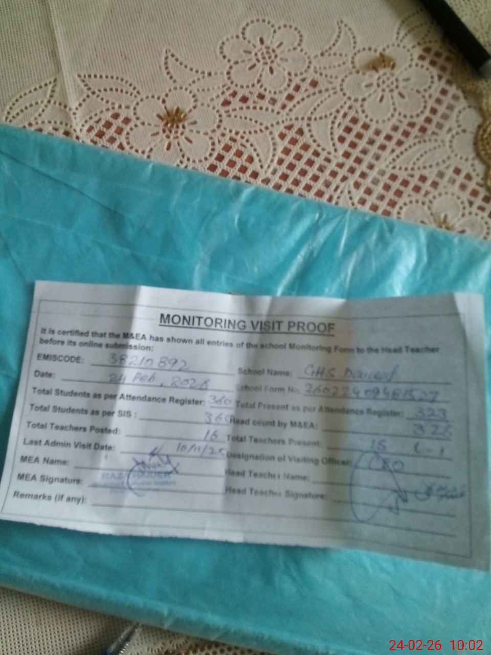| Certified that this School was Inspected by the Undersigned MEA/DMO Today and the Information Stated Above is as Per Record. | |||||
