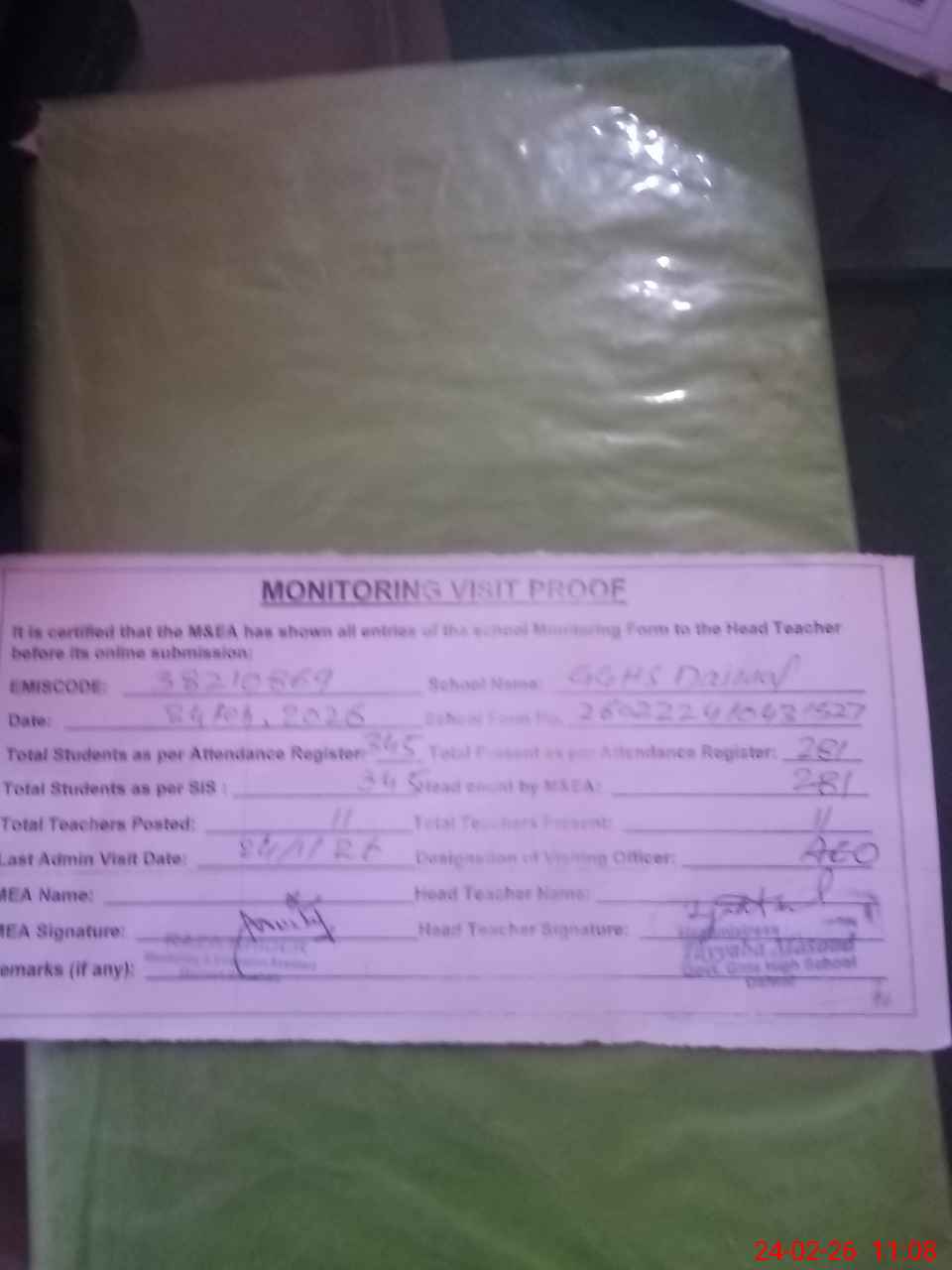 | Attendance Register | Head Teacher | MEA with School | Visit Proof |