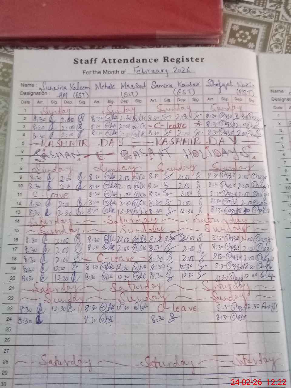 | Leave | Duty | Absent | Maternity | Medical | Ex- Pak |