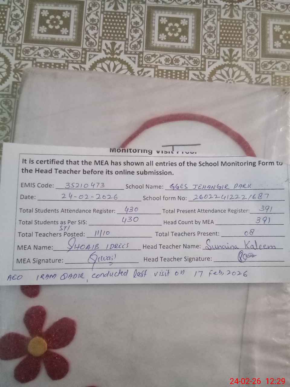 | Certified that this School was Inspected by the Undersigned MEA/DMO Today and the Information Stated Above is as Per Record. | |||||