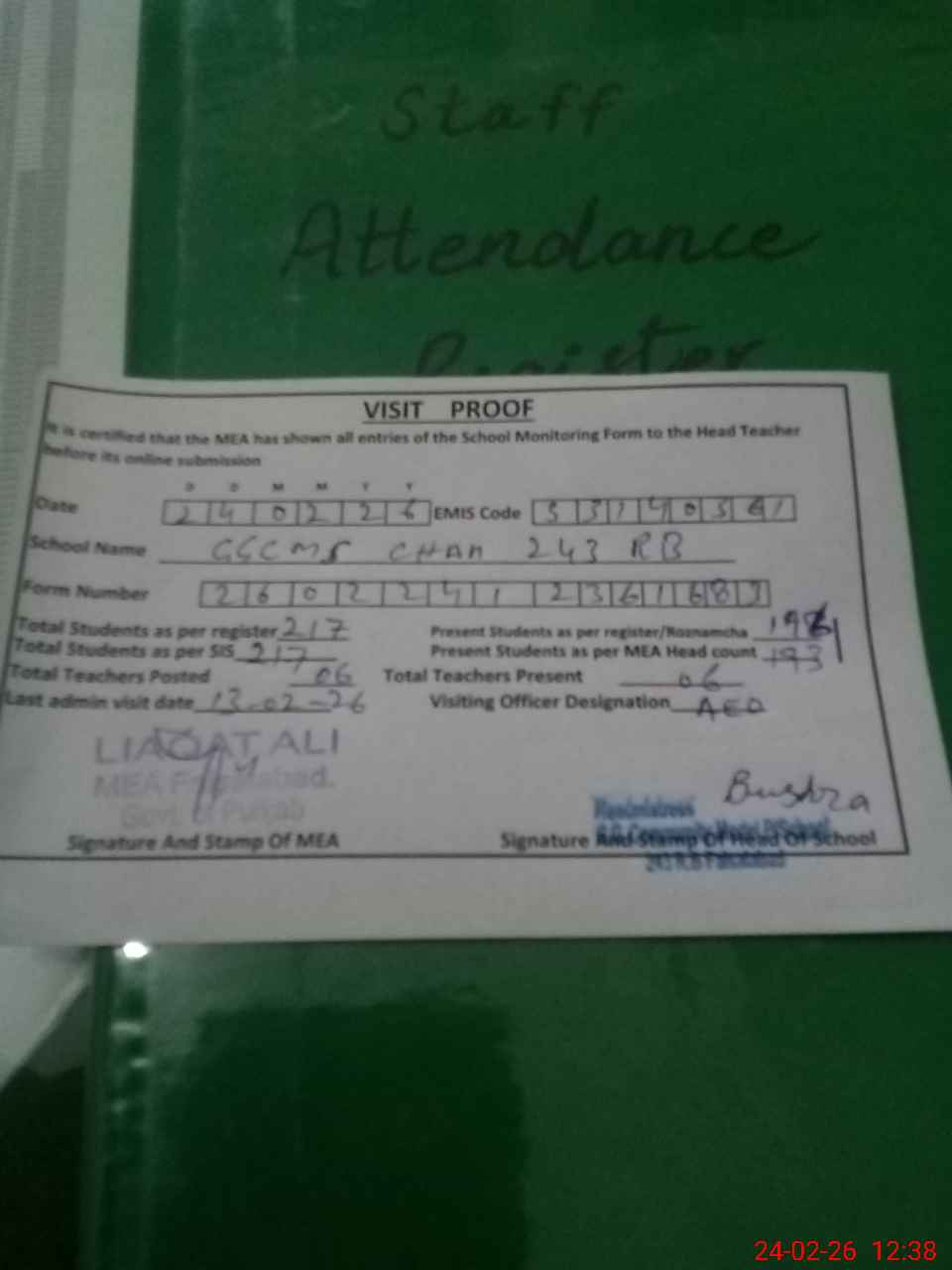 | Attendance Register | Head Teacher | MEA with School | Visit Proof |