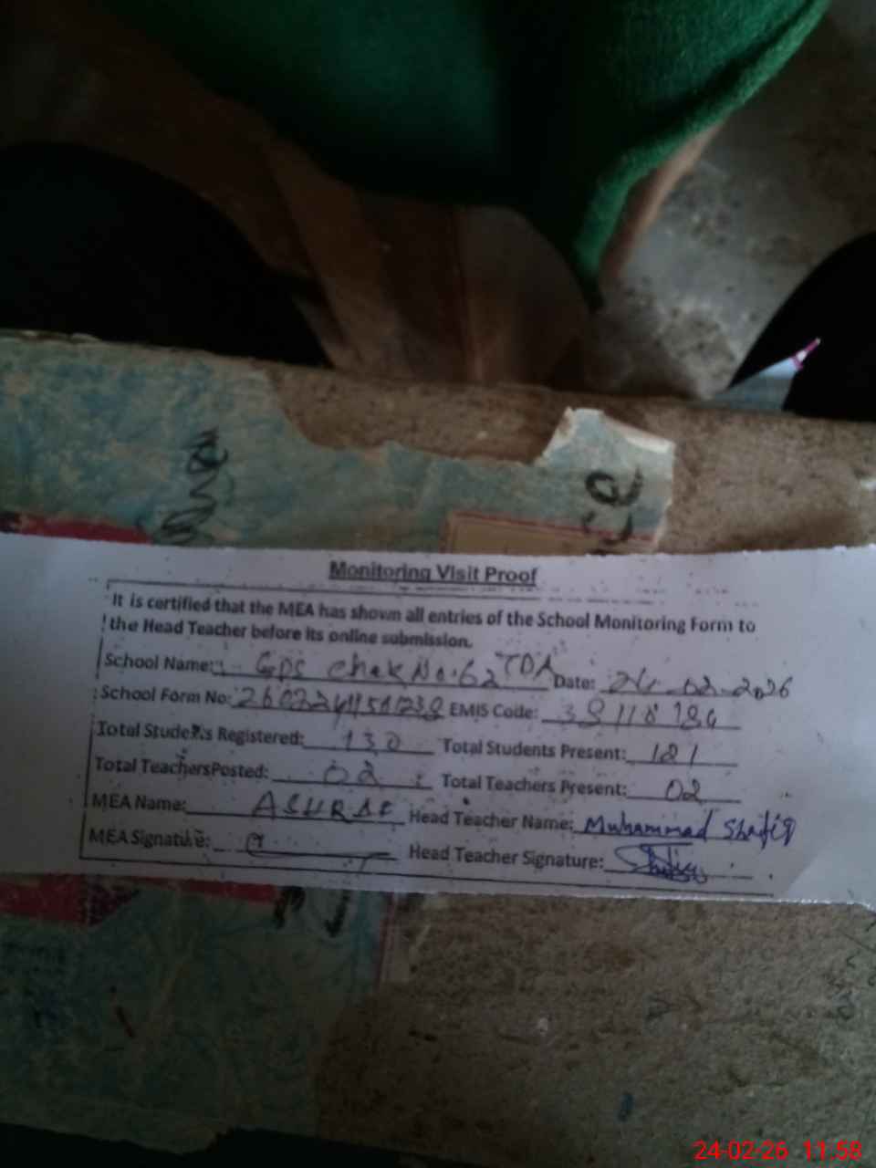 | EMIS Code: 38110184 | Name of School: GPS CHAK NO 62 TDA | |||