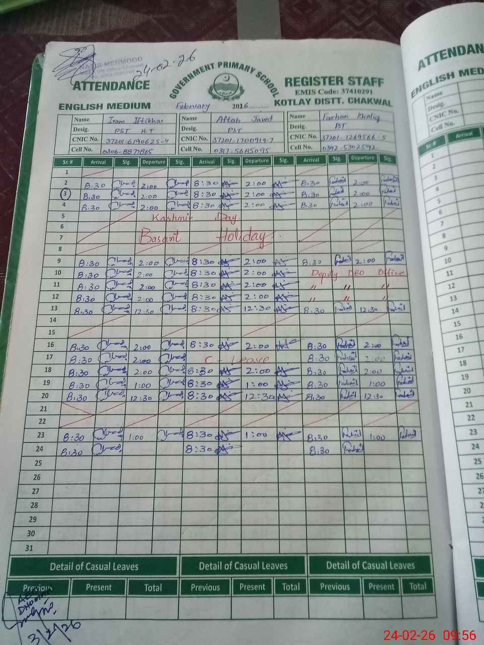 | CNIC | Full Name | Designation | R/C | Absence during last cal. month |