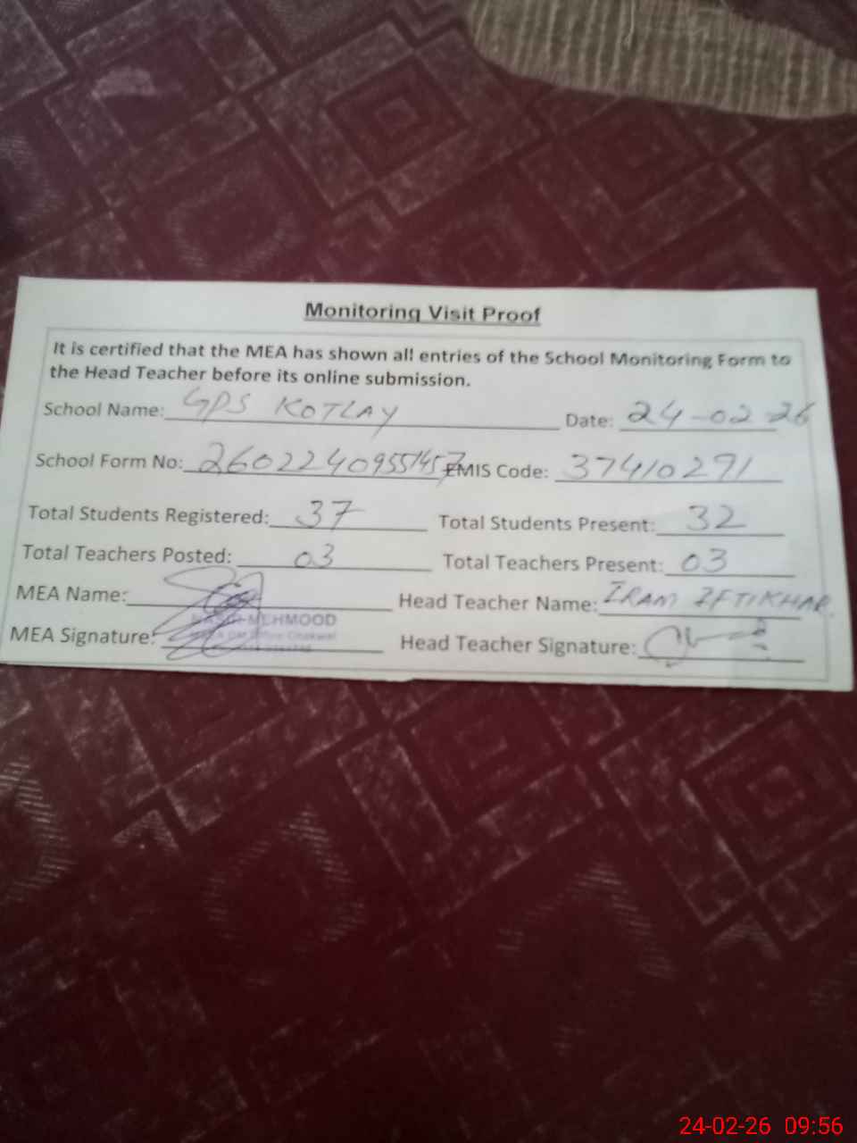 | Attendance Register | Head Teacher | MEA with School | Visit Proof |