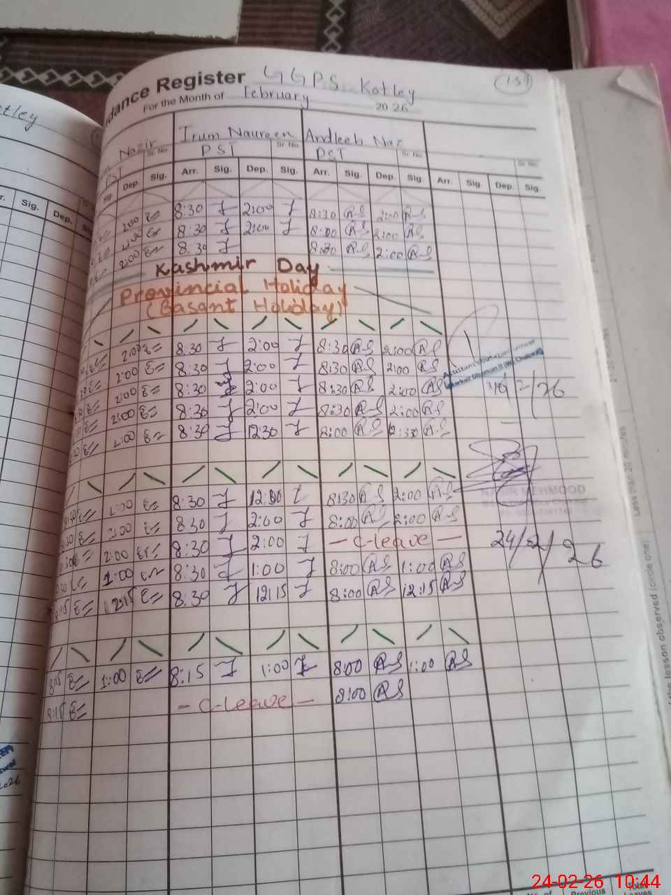 | 61**** | Ir**** Na**** | PST Science/Maths | Regular | 1 | 0 | 0 | 0 | 0 | 0 | 0 | 0 | 1 | Absent (Un-Authorized) |