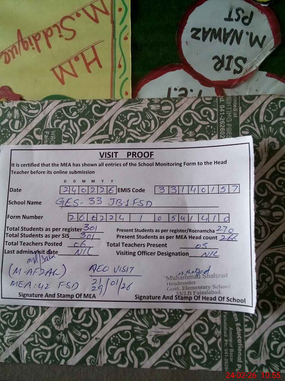 | Certified that this School was Inspected by the Undersigned MEA/DMO Today and the Information Stated Above is as Per Record. | |||||