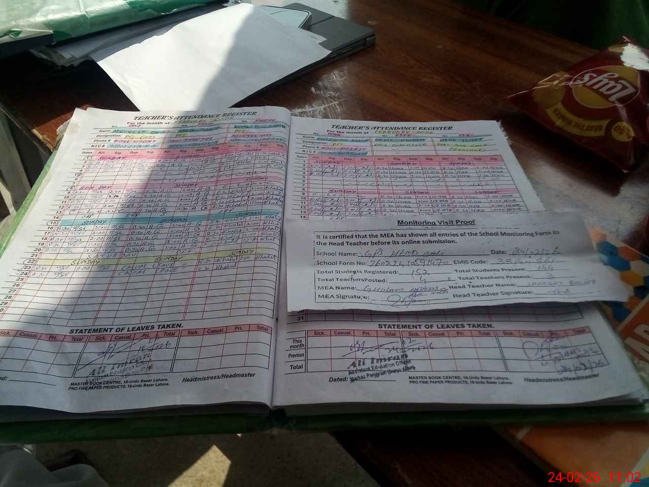 | Attendance Register | Head Teacher | MEA with School | Visit Proof |