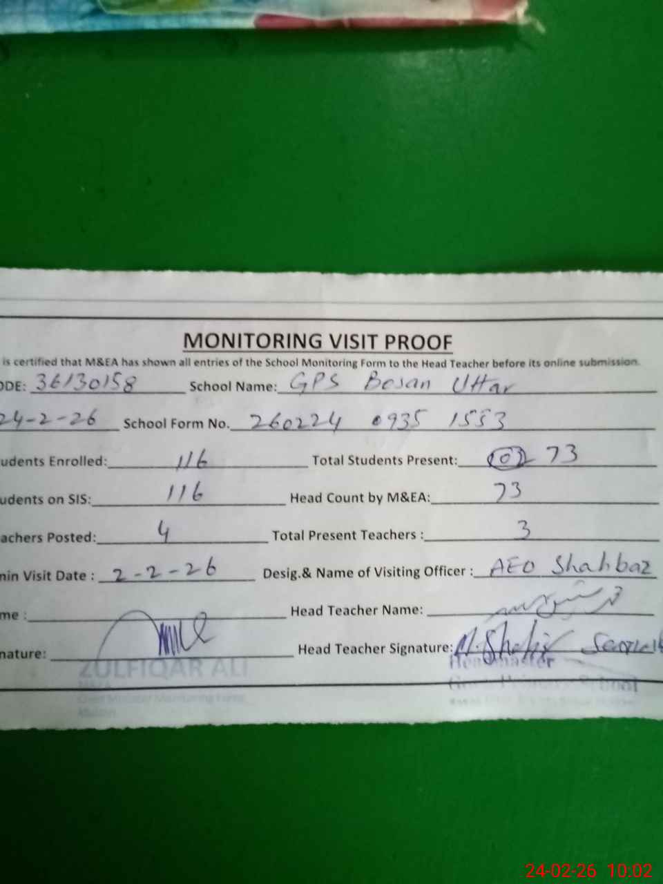 | Monitoring Date: 24-02-2026 | Start Time: 24-02-2026 09:35 AM | End Time: 24-02-2026 10:03 AM | Name of MEA: Zu**** Al**** | |