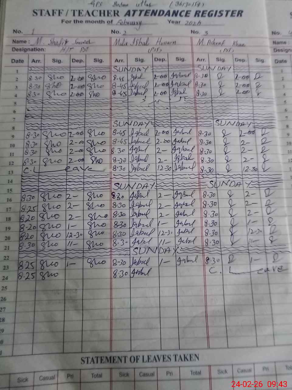 | CNIC | Full Name | Designation | R/C | Absence During Last Calender Month |