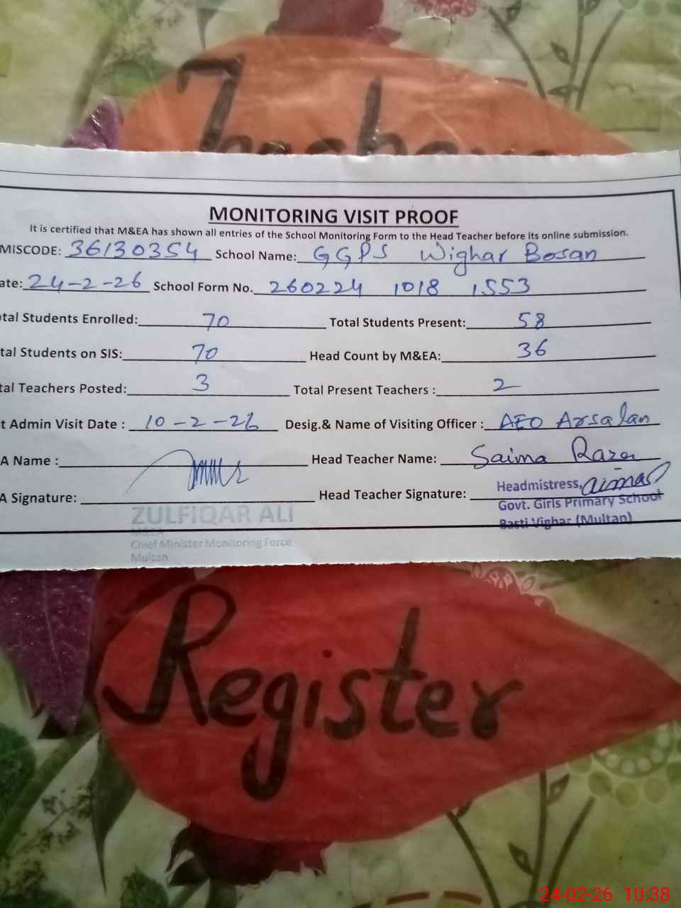 | EMIS Code: 36130354 | Name of School: GGPS BASTI WIGHAR BOSAN HITTAR P.BOX MULTAN | |||