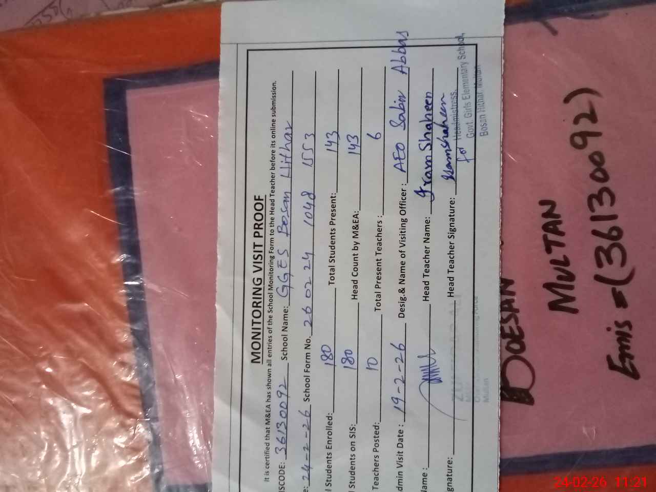 | Attendance Register | Head Teacher | MEA with School | Visit Proof |