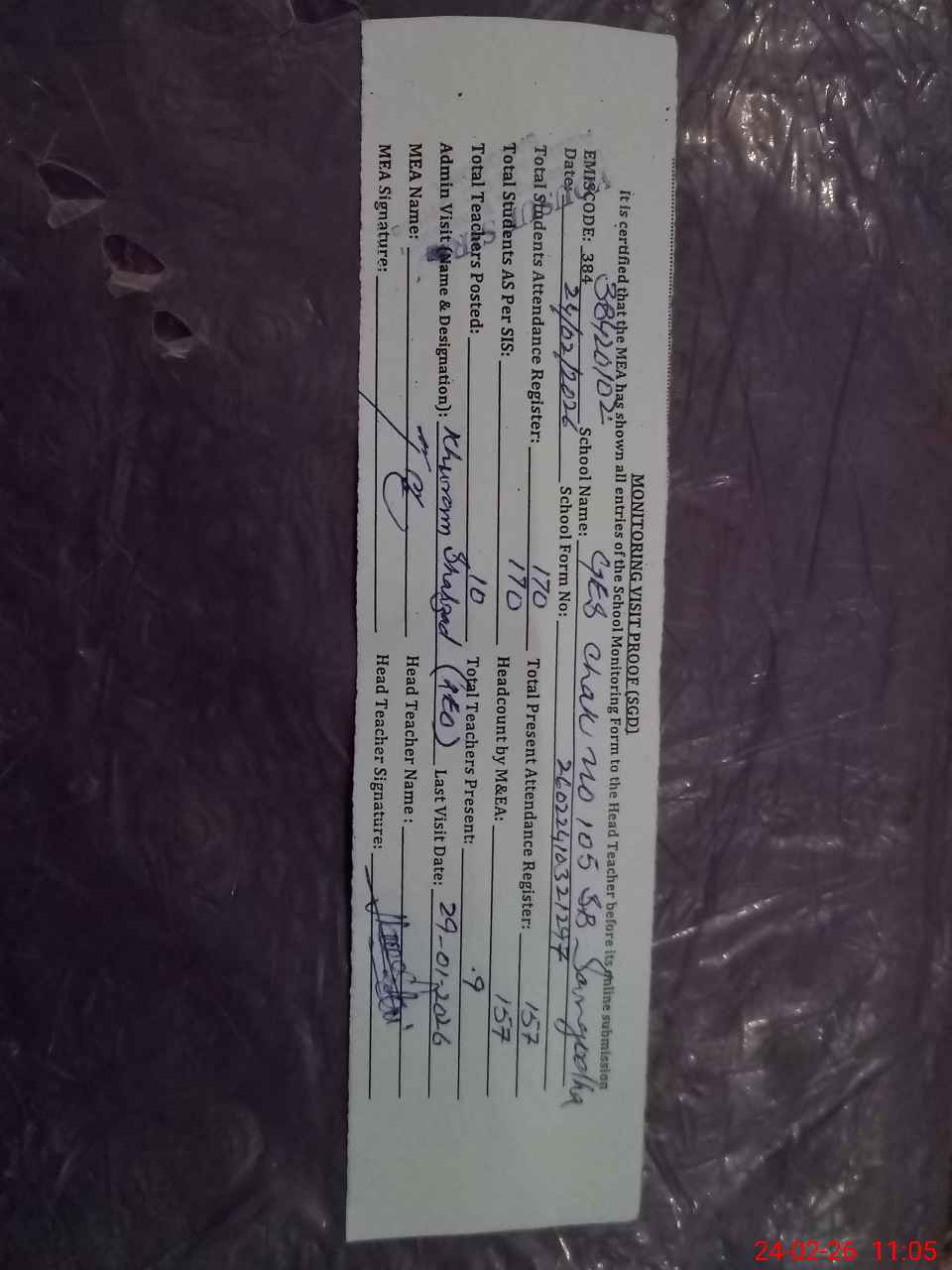 | Attendance Register | Head Teacher | MEA with School | Visit Proof |