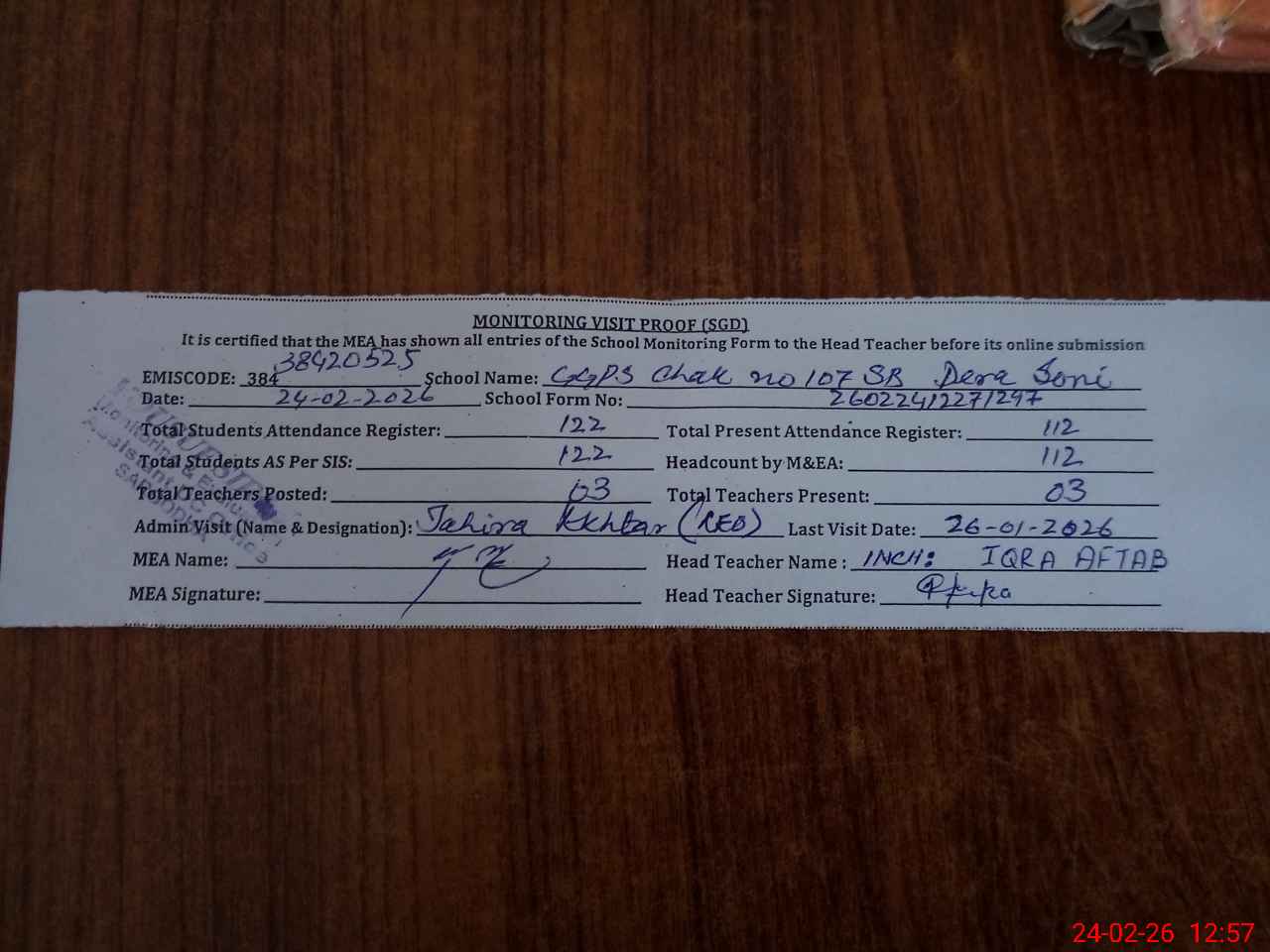 | EMIS Code: 38420525 | Name of School: GGPS CHAK NO.107 SB DERA SONI DIN DAR | |||