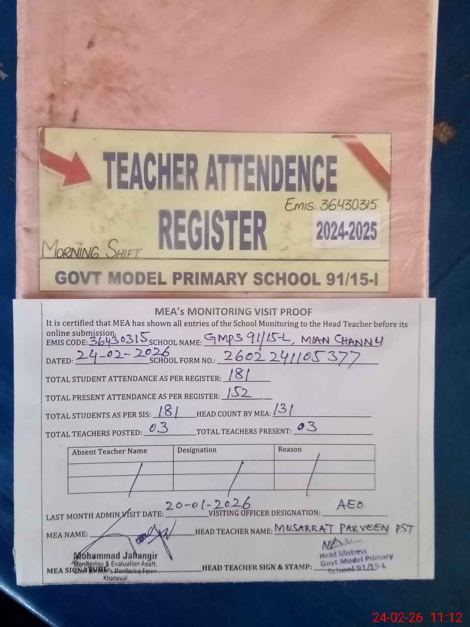 | Attendance Register | Head Teacher | MEA with School | Visit Proof |