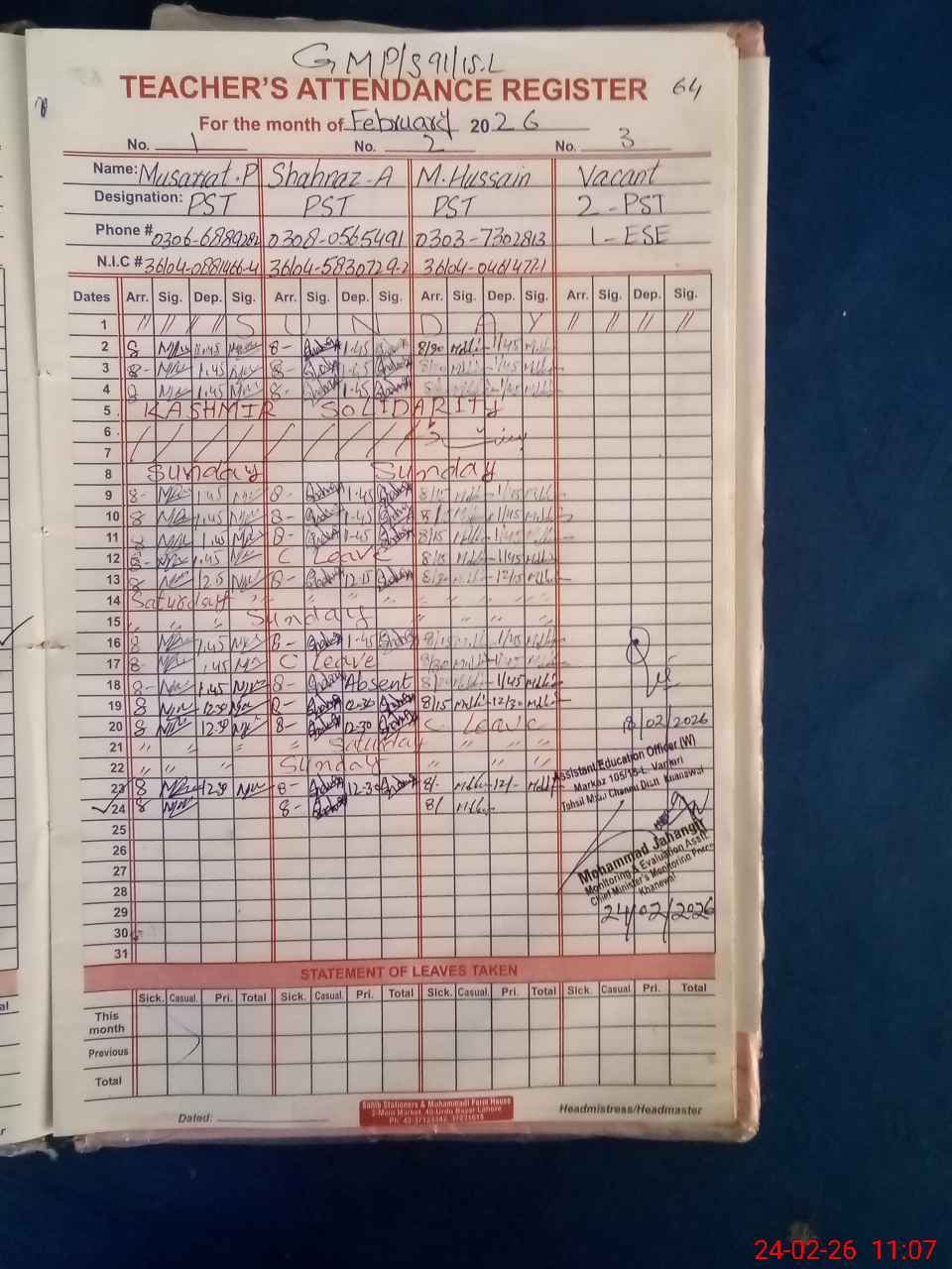 | Name: MU**** PA**** Designation: (School Headmaster's/Headmistress's) PST Phone/Cell Number: 03**** |