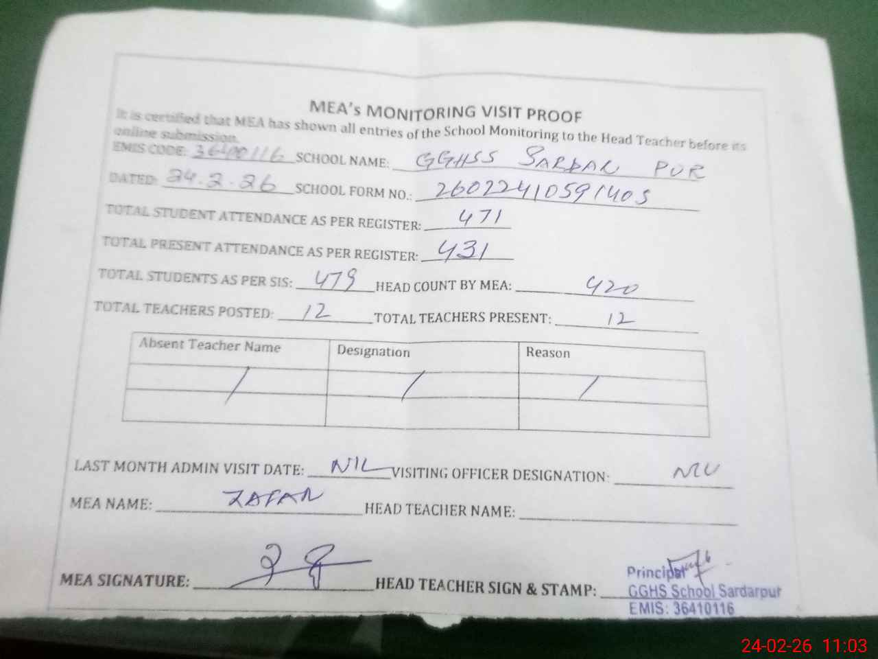 | Attendance Register | Head Teacher | MEA with School | Visit Proof |
