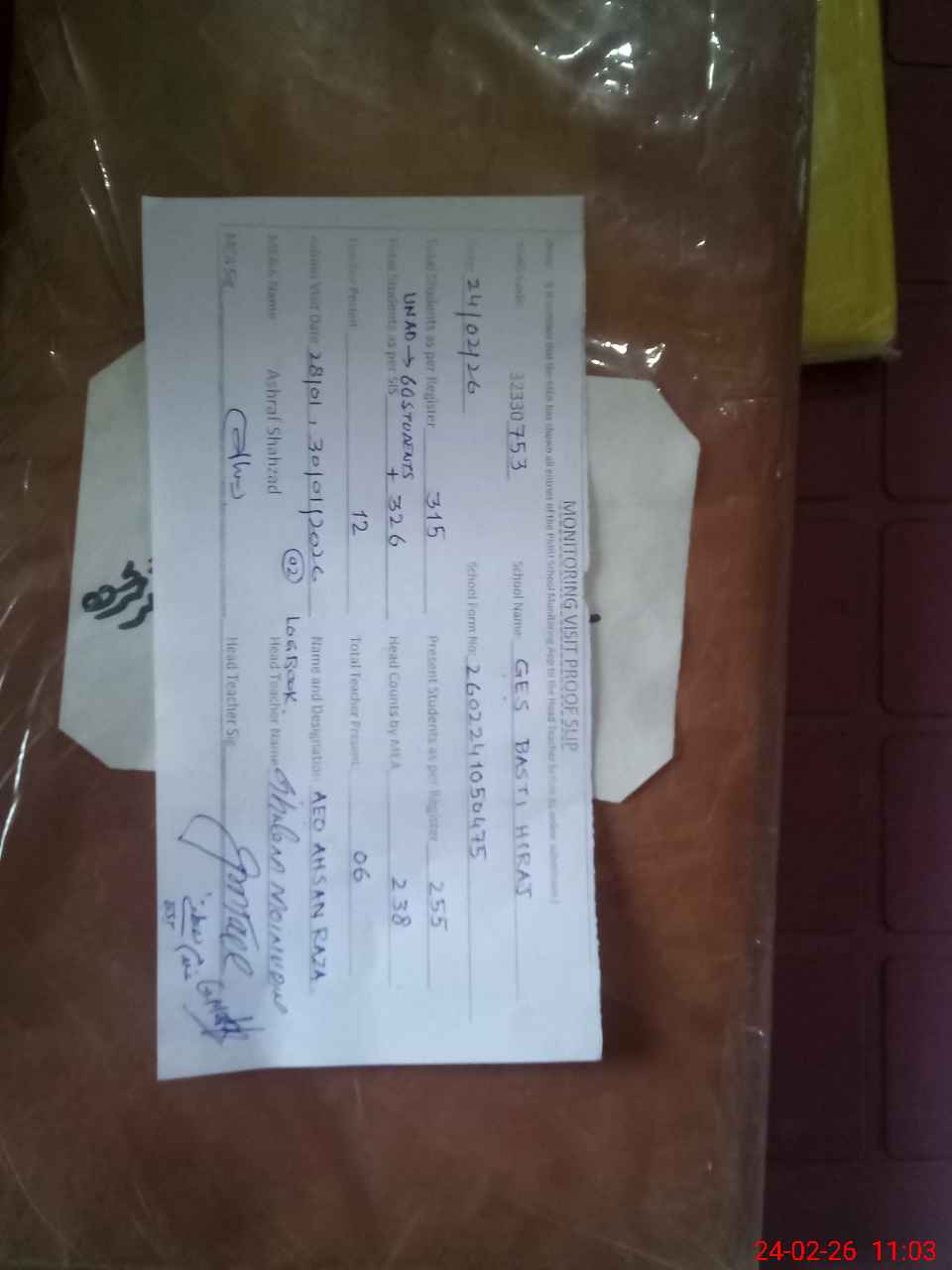 | Attendance Register | Head Teacher | MEA with School | Visit Proof |