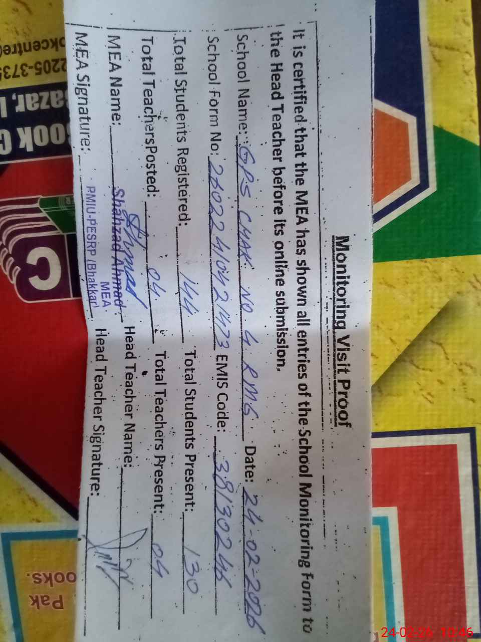 | Attendance Register | Head Teacher | MEA with School | Visit Proof |