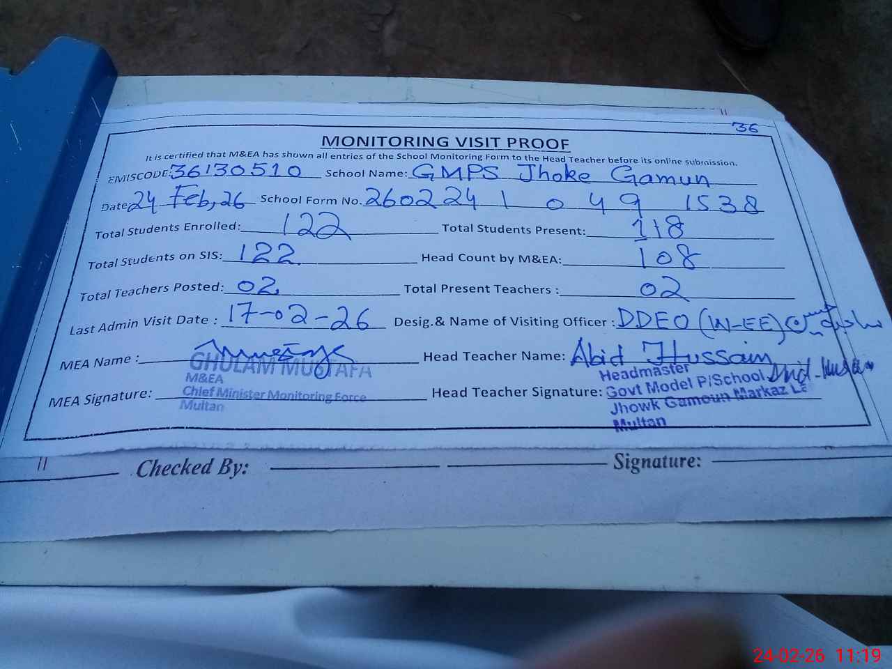 | Certified that this School was Inspected by the Undersigned MEA/DMO Today and the Information Stated Above is as Per Record. | |||||