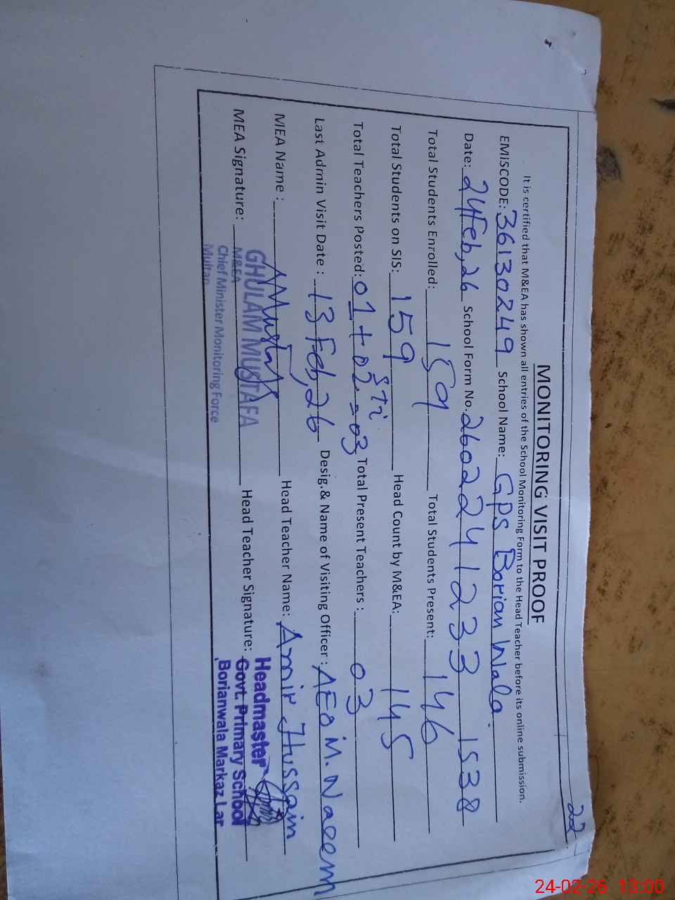 | EMIS Code: 36130249 | Name of School: GPS BORIAN WALA | |||