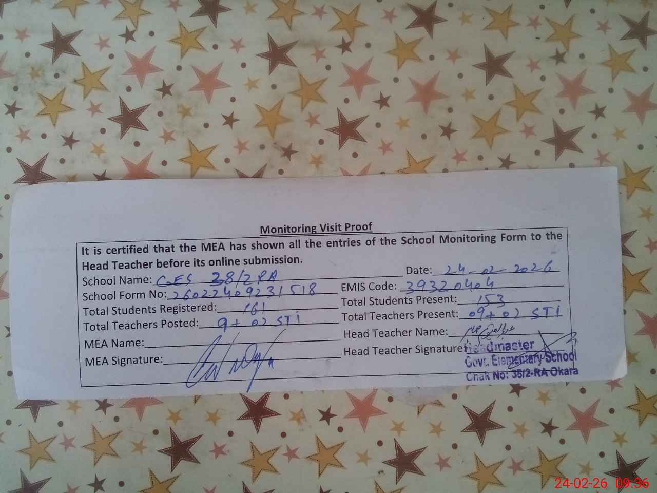 | Attendance Register | Head Teacher | MEA with School | Visit Proof |