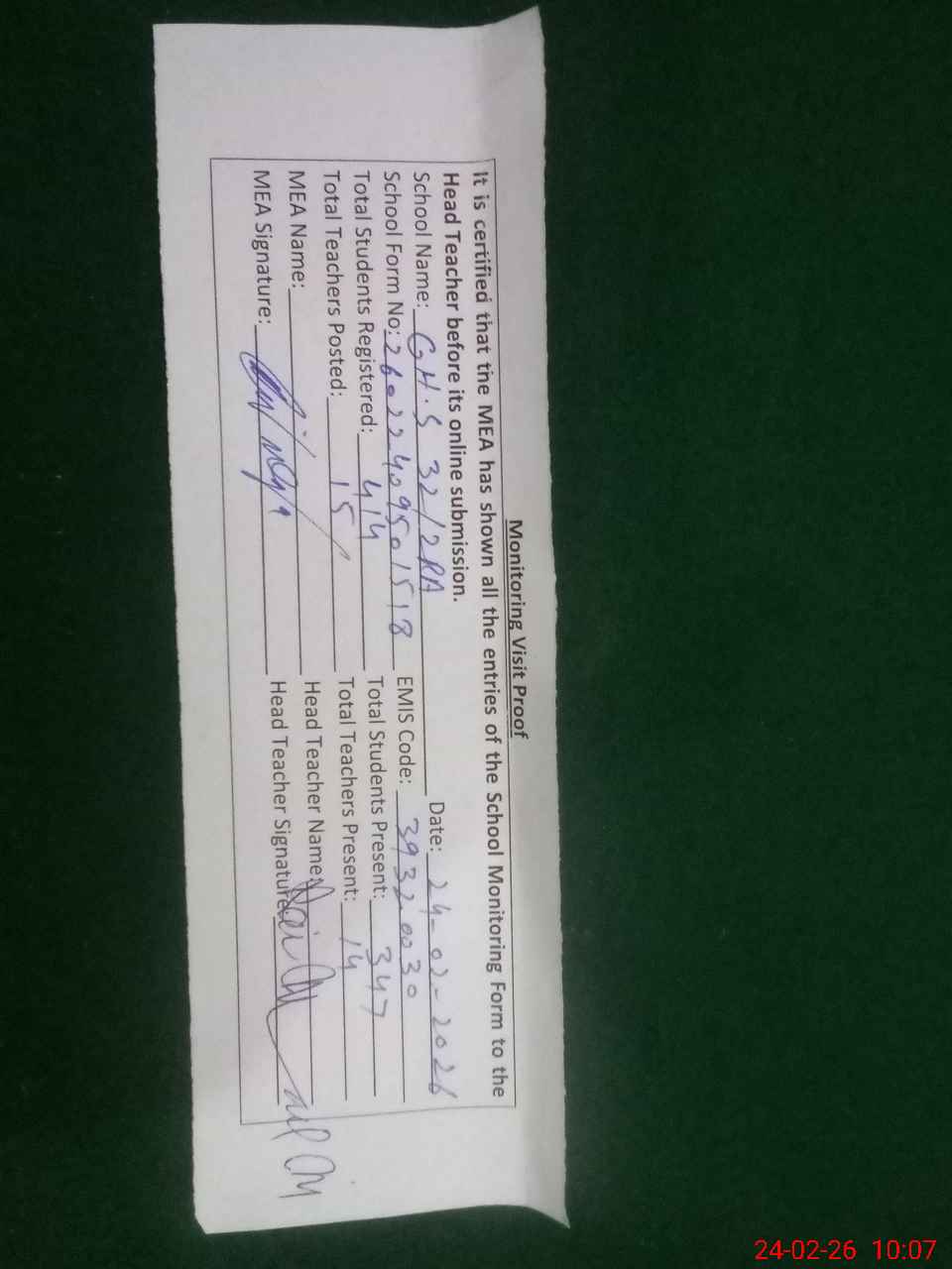 | Certified that this School was Inspected by the Undersigned MEA/DMO Today and the Information Stated Above is as Per Record. | |||||