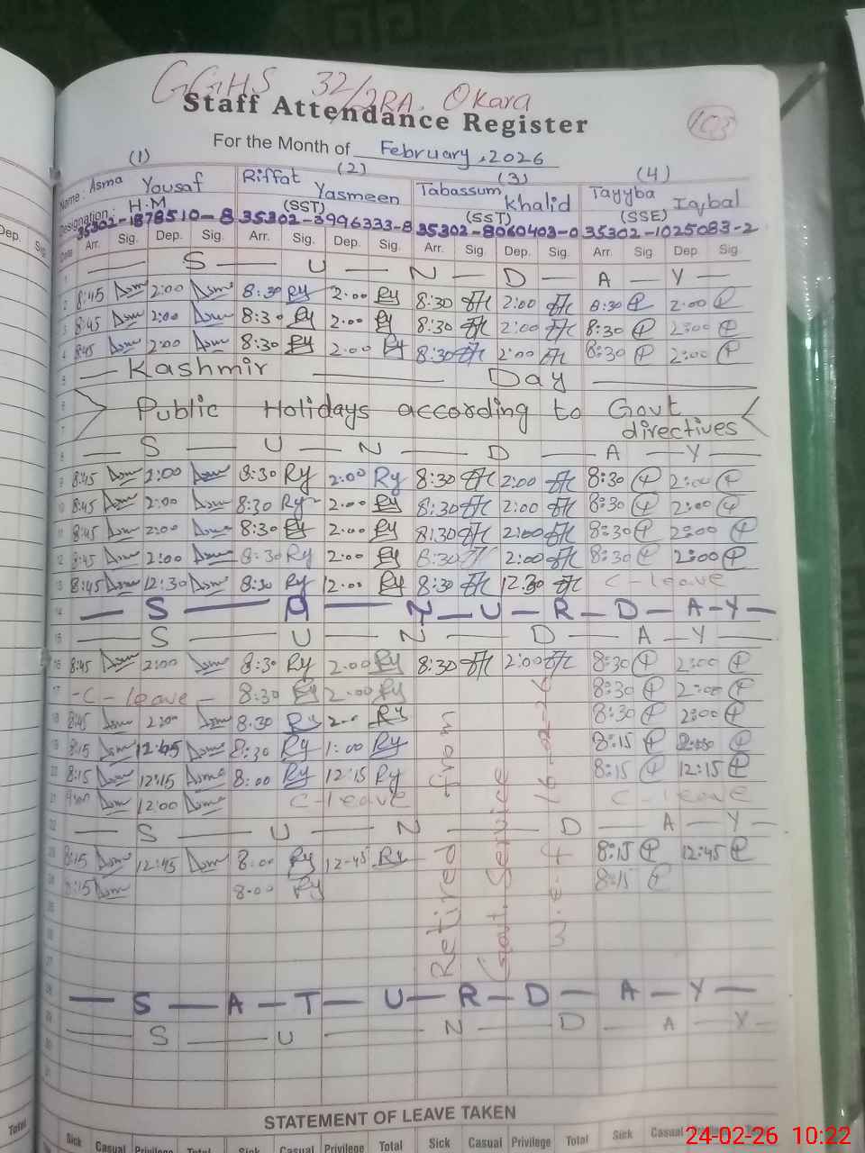 | Leave | Duty | Absent | Maternity | Medical | Ex- Pak |