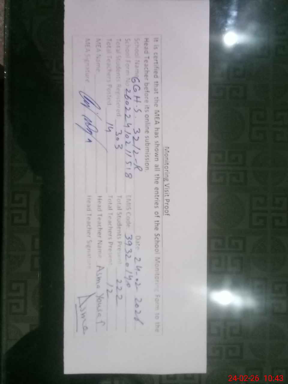 | Certified that this School was Inspected by the Undersigned MEA/DMO Today and the Information Stated Above is as Per Record. | |||||