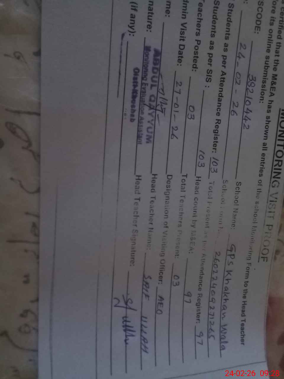 | EMIS Code: 38210442 | Name of School: GPS KHAKHAN WALA | |||