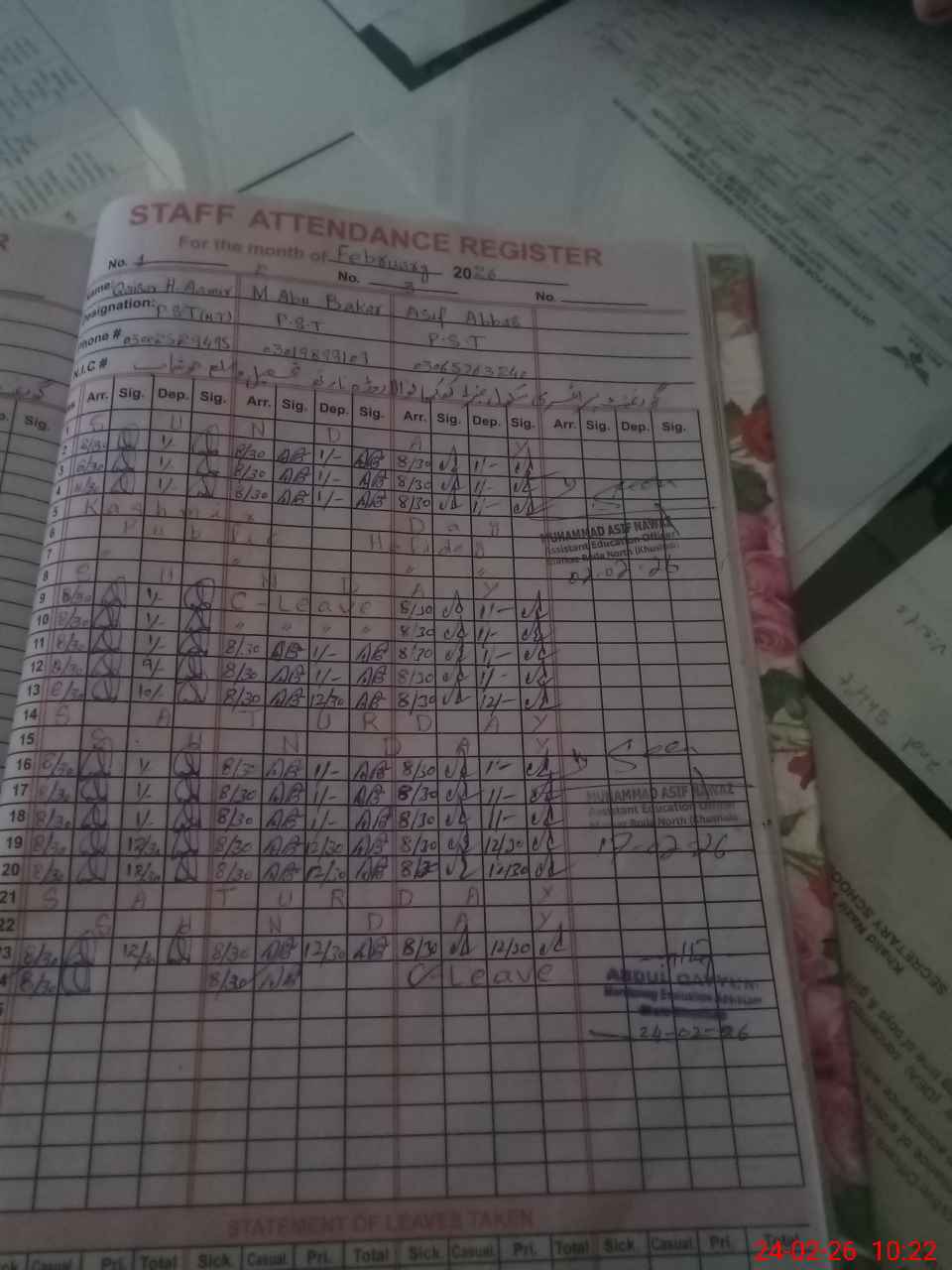 | Name: Qa**** Hu**** Aa**** Designation: (School Headmaster's/Headmistress's) PST Phone/Cell Number: 03**** |