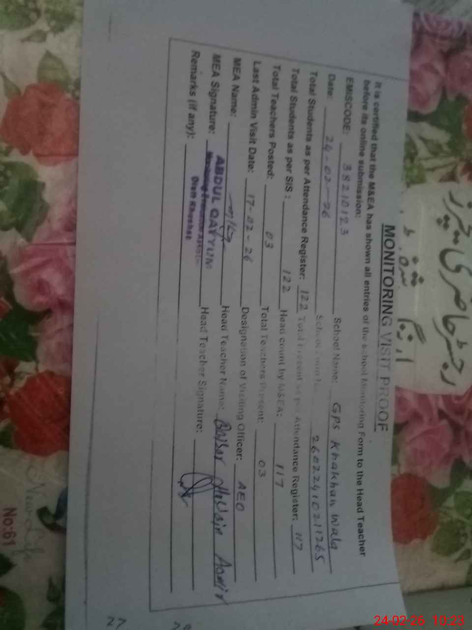 | EMIS Code: 38210123 | Name of School: GPS KHAKHAN WALA | |||