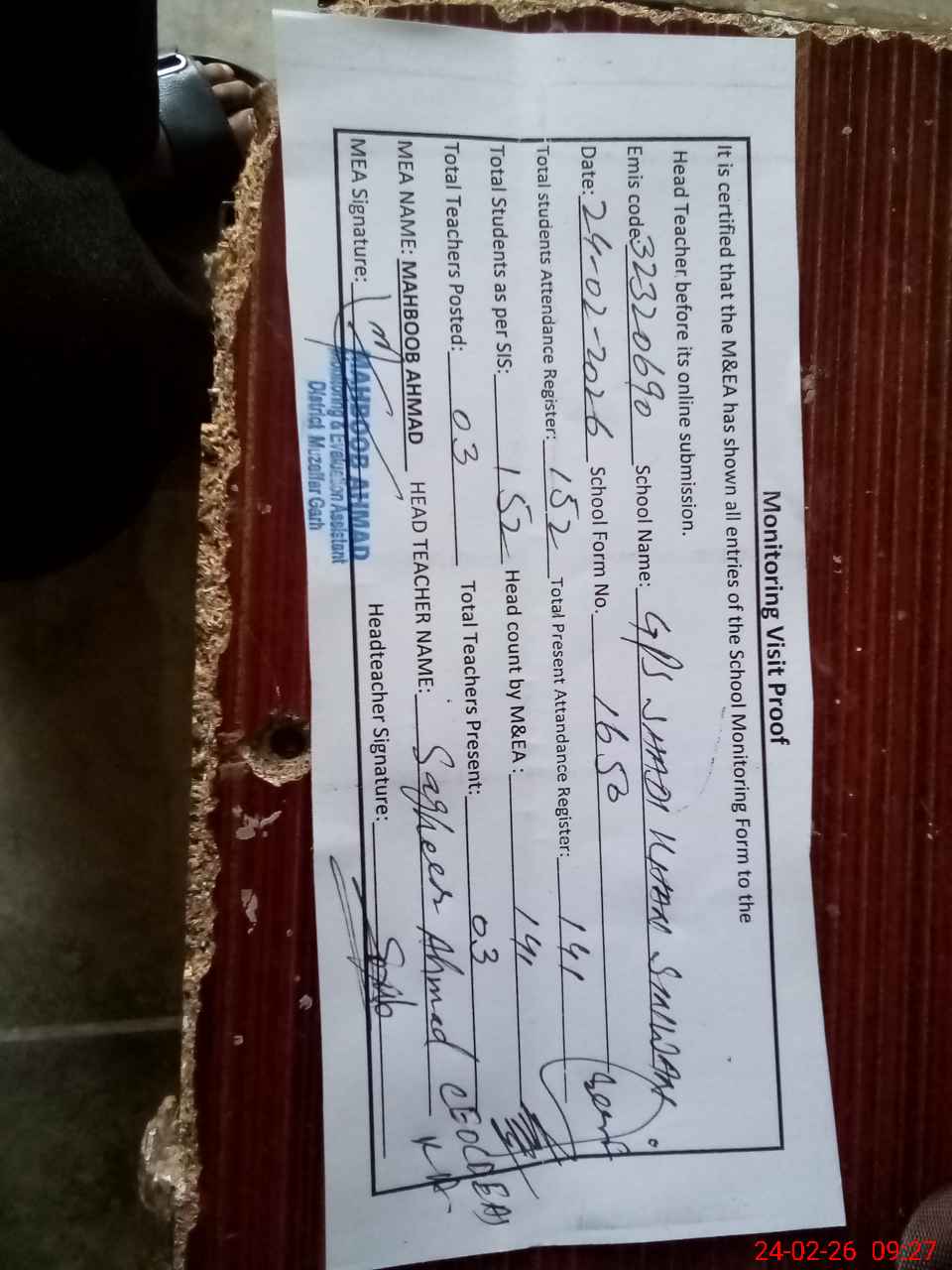 | EMIS Code: 32320690 | Name of School: GPS SHADI KHAN SINAWAN | |||