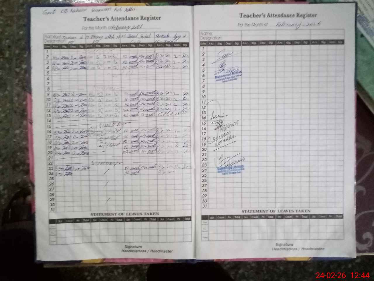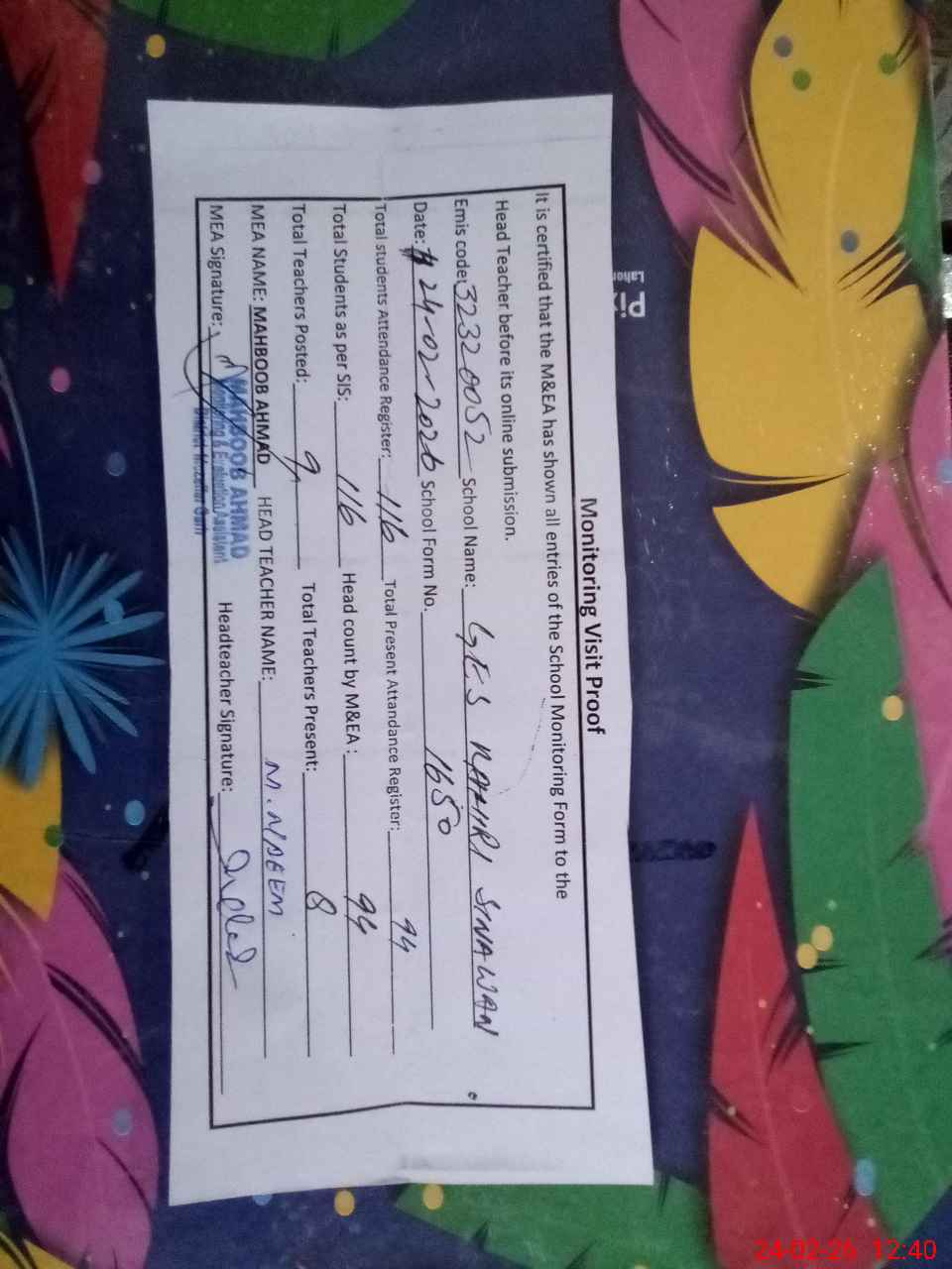 | Attendance Register | Head Teacher | MEA with School | Visit Proof |