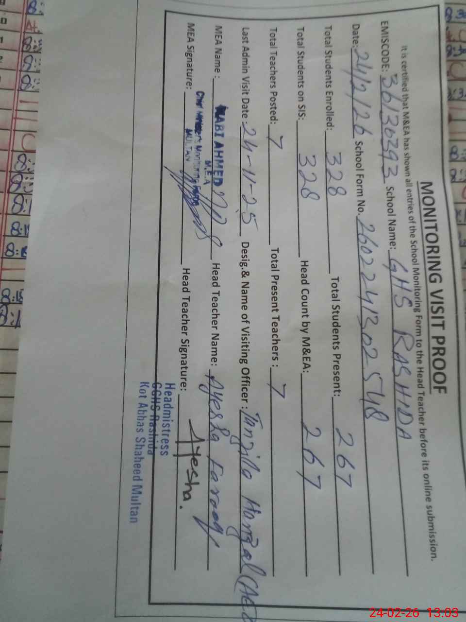 | EMIS Code: 36130393 | Name of School: GGHS RASHIDA, KOT ABBAS SHAHEED | |||