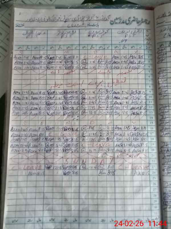 | CNIC | Full Name | Designation | R/C | Absence During Last Calender Month |