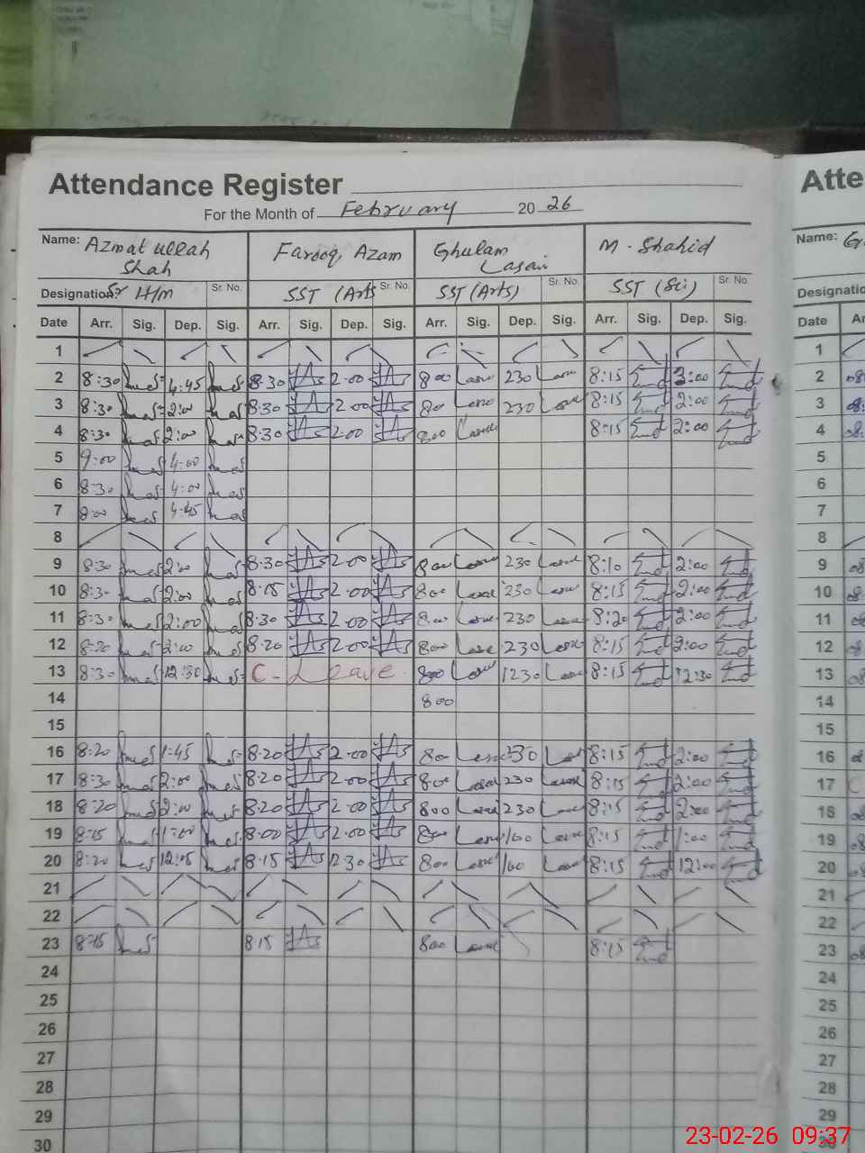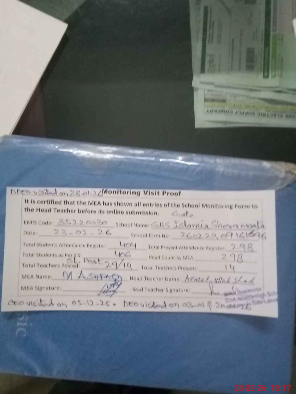 | Remarks (Use Separate Page if Required): CEO Nazir Ahmad Chhina visited on 05-12-2025 DEO Muhammad Arif visited twice on 03-01-2026 and 20-01-2026 DDEO Muhammad Hussain visited on 28-01-2026 Paint work in progress at some points and several points need for paint work 35220030 | |||||