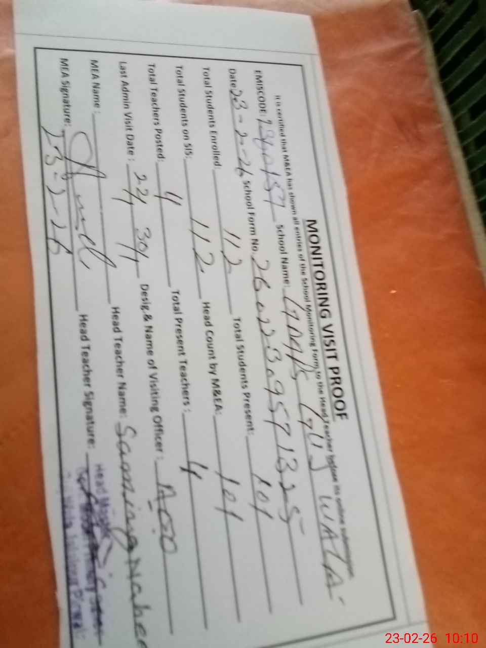| Attendance Register | Head Teacher | MEA with School | Visit Proof |