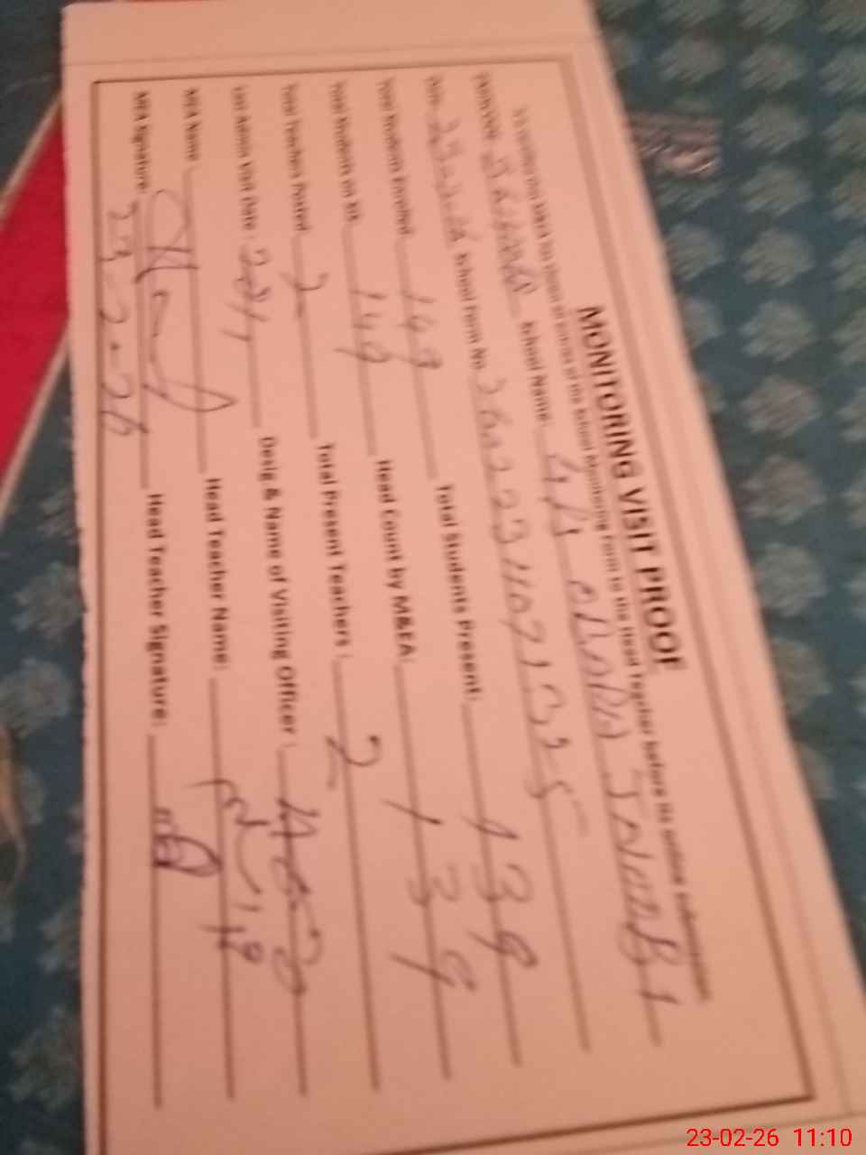 | Attendance Register | Head Teacher | MEA with School | Visit Proof |